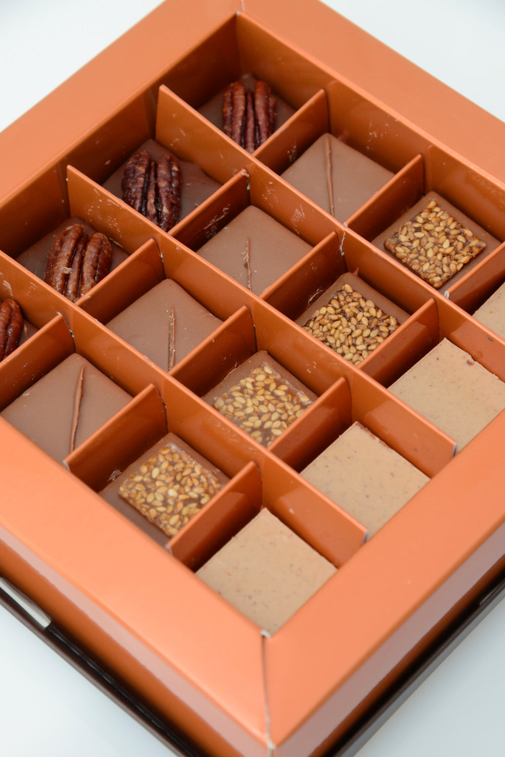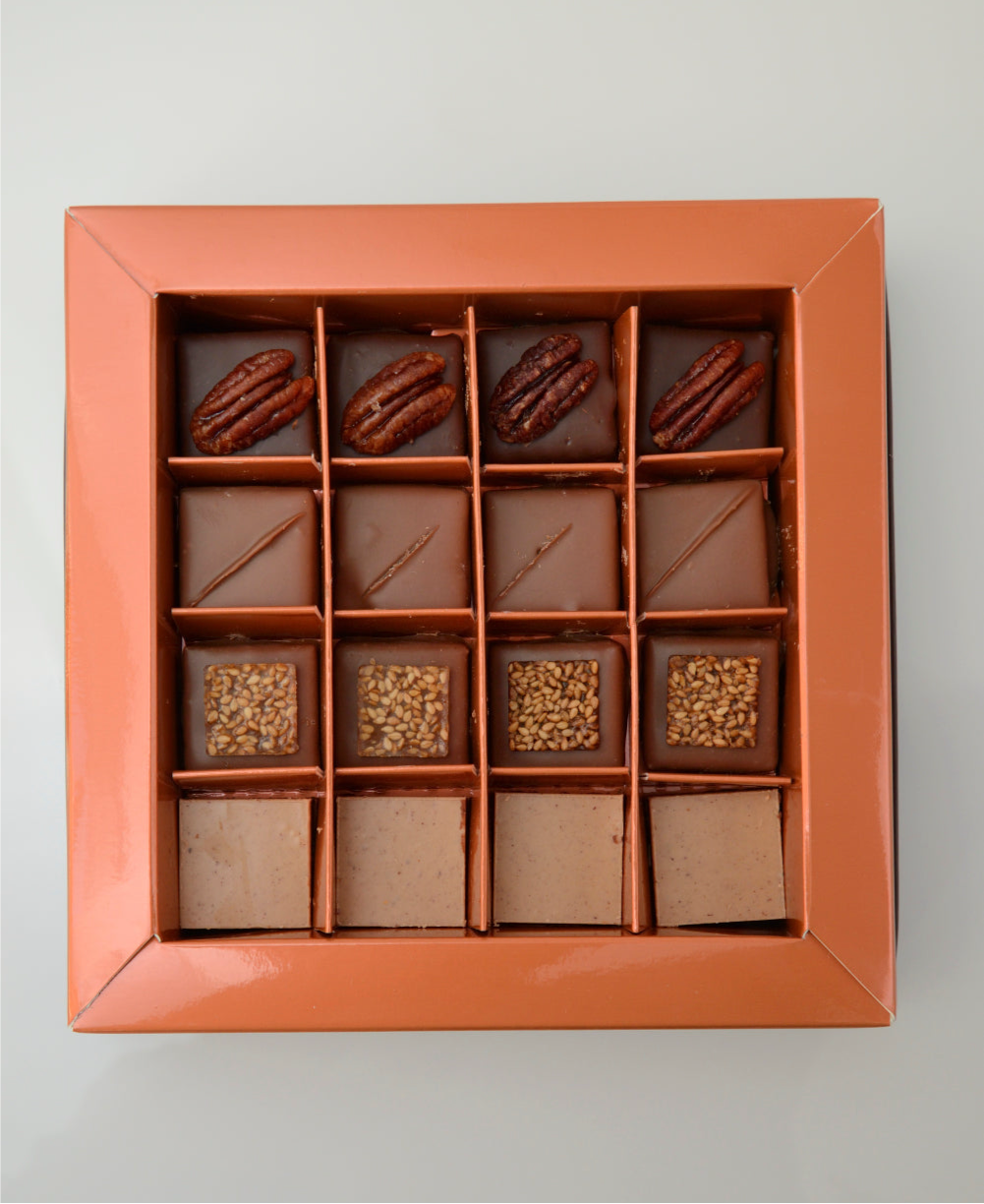 Ingredienti:Boules caramello salato[Caramello:Zucchero, Panna 35% di grassi UHT [PANNA, Stabilizzante [Carragenina]],BURRO82% - multiuso, Sciroppo di glucosio, Sale marino, Aroma naturale di vaniglia -Ricopertura:Cioccolato fondente da copertura (70% cacao min.) [Fave di cacao, Zucchero, Burro di cacao, Emulsionante [E322 (girasole)], Estratto naturale di vaniglia], Cacao in polvere (100% cacao)] , cremino alla nocciola[Cioccolato di copertura al latte (39% cacao min.) [Zucchero, Burro di cacao,LATTEscremato in polvere, Fave di cacao,BURROconcentrato, Emulsionante [Lecitina diSOIA]], Pasta diNOCCIOLEtostate Napoli,BURROconcentrato - Glacier extra] , Cremino pistacchio[Ripieno:Cioccolato bianco (33% burro di cacao min.) [Burro di cacao,LATTEintero in polvere, Zucchero, Emulsionante [E322 (girasole)], Estratto naturale di vaniglia], Pasta diPISTACCHIO, Olio di riso, Burro di cacao,BURROconcentrato - Glacier extra -Granella diPISTACCHIO] , Corpo solido alle arachidi[Ingredienti:Cioccolato di copertura al latte (39% cacao min.) [Zucchero, Burro di cacao,LATTEscremato in polvere, Fave di cacao,BURROconcentrato, Emulsionante [Lecitina diSOIA]], Pasta diARACHIDItostate, Cioccolato bianco (33% burro di cacao min.) [Burro di cacao,LATTEintero in polvere, Zucchero, Emulsionante [E322 (girasole)], Estratto naturale di vaniglia], Burro di cacao,BURROconcentrato - Glacier extra, Olio diARACHIDE-Granella diARACHIDI] , Gianduia al lampone[Ingredienti:Specialità a base di burro di cacao e lampone [Zucchero, Burro di cacao (35,9%), Lampone in polvere (11,5%), Emulsionante [Lecitina diSOIA],LATTE], Pasta pura diMANDORLAsiciliana pelata 100%,BURROconcentrato - Glacier extra, Olio di riso -Granella di lampone croccante [Sciroppo di glucosio, Zucchero, Lamponi (25,00 %), Addensante [Alginato di sodio]]]